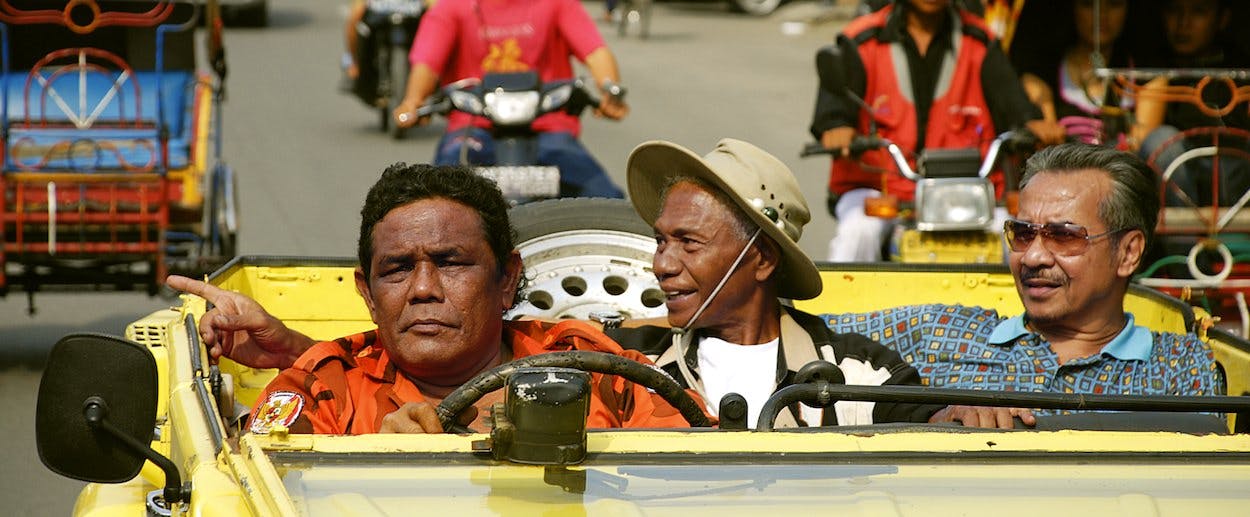 The decision to tell the story from the perspective of the killers made for an uncomfortable filmmaking experience. At one point, Herman and a troupe of thugs move from shopkeeper to shopkeeper in an outdoor market, demanding money with each one. The close-up shots of shopkeepers’ faces—the tight distress, the sense of pained inevitability—are particularly hard to watch. Oppenheimer himself was so disturbed that he stayed behind after each extortion under the guise of having the shopkeepers sign a release form, then quietly paid each vendor back. “In hindsight I’m not sure it was a good idea,” Oppenheimer admitted. “It could have been dangerous for us.” In another scene, a man confesses that his own stepfather was killed in the genocide, then goes on to participate in a campy reenactment in which he plays the part of a victim. It made Oppenheimer feel ill; he had no idea before editing the footage that an actual victim was among the actors. His cinematographer, who didn’t speak Indonesian, recorded the story without knowing what it was about.