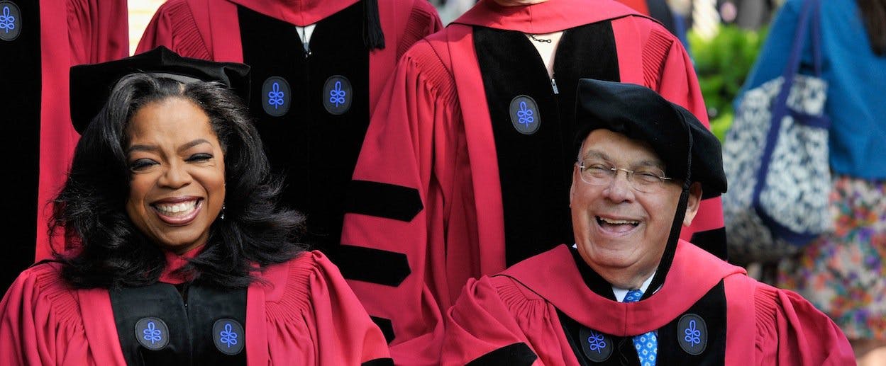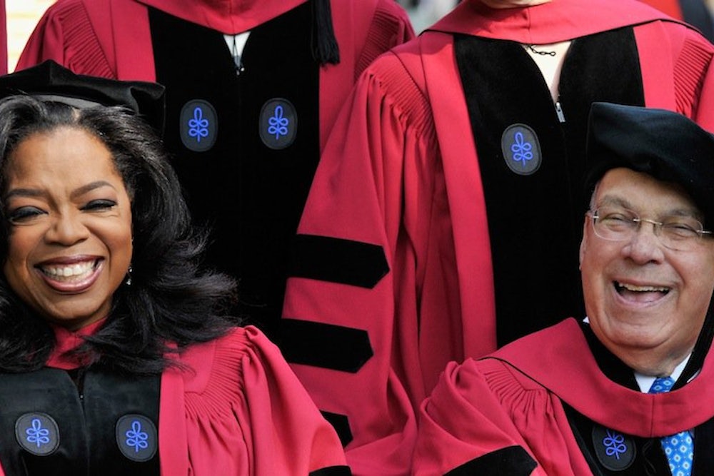 There is something special about the optimism of the very privileged. At Harvard not long ago, Oprah Winfrey spoke to the graduating class and, “address[ing] my remarks to anybody who has ever felt inferior or felt disadvantaged, felt screwed by life,” uttered this memorable sentence: “There is no such thing as failure.” She immediately explained her strange assertion: “Failure is just life trying to move us in another direction.” The experience of defeat, in other words, is an error of interpretation. Nothing is bad that is followed by something else. Nothing is bad unless you call it bad. Only death, on this account, is a defeat, since it is followed by nothing, though I suppose that in her quackery Winfrey believes in an afterlife in which she dwells for eternity between Tom Cruise and Maya Angelou at God’s Oscar party. As an example of the unreality of failure, Winfrey told a tale of personal adversity. When she launched her television network, it did not do well. “I was stressed and I was frustrated and quite frankly I was embarrassed.” But somehow she rose from the ashes. “I’m here today to tell I have turned that network around!” The audience in Harvard Yard must have fought back tears.