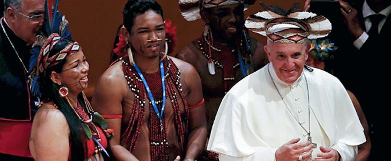 Pope Francis wears an indigenous feathered hat given to him by representatives of one of Brazil's native tribes during a meeting at the Municipal Theater in Rio de Janeiro, Brazil, Saturday, July 27, 2013.