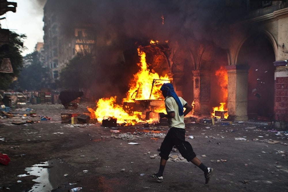 He says the opening stages of an Islamist counterattack are already underway, with soldiers killing other soldiers rather than cooperating with the slaughter of Egyptians. (There are no reports of friendly-fire attacks yet.) "This will end when the Egyptian military is destroyed," he says. "We will not be Algeria," site of a decade-long war between Islamists and the military, "because in six months the Egyptian military will be finished."