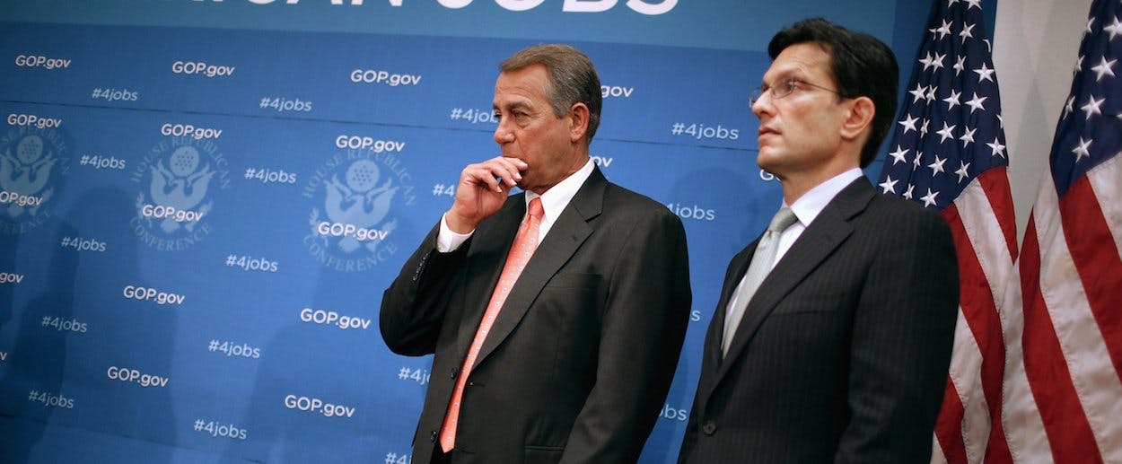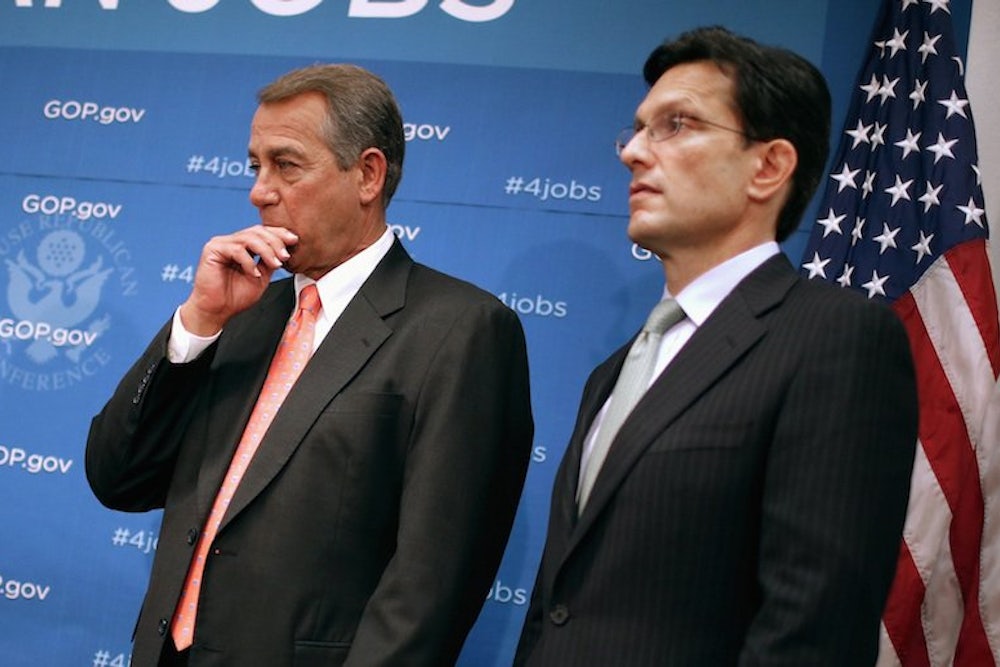 That's part one of the plan. In part two, which Majority Leader Eric Cantor outlined, Republicans would attach an Obamacare provision to legislation raising the Treasury's debt ceiling. This provision apparently wouldn’t defund Obamacare per se. Instead, it would delay implementation for one year, in exchange for about one year’s worth of borrowing authority. But the point of the delay is to defund and destroy the law, as conservatives will happily tell you: "If it can be delayed once, it can be delayed again and again, and then repealed," Jeffrey Anderson and James Capretta write in the Weekly Standard. Of course, Democrats know this too. And Obama has sworn not to negotiate over the debt ceiling. Stalemate could ensue, leaving the government with no way to pay existing bills on time. Even the threat of such default could hurt the economy, just as it did during the debt ceiling debate of 2011.