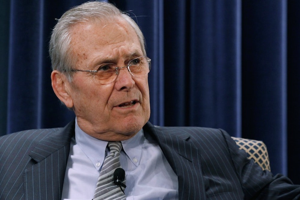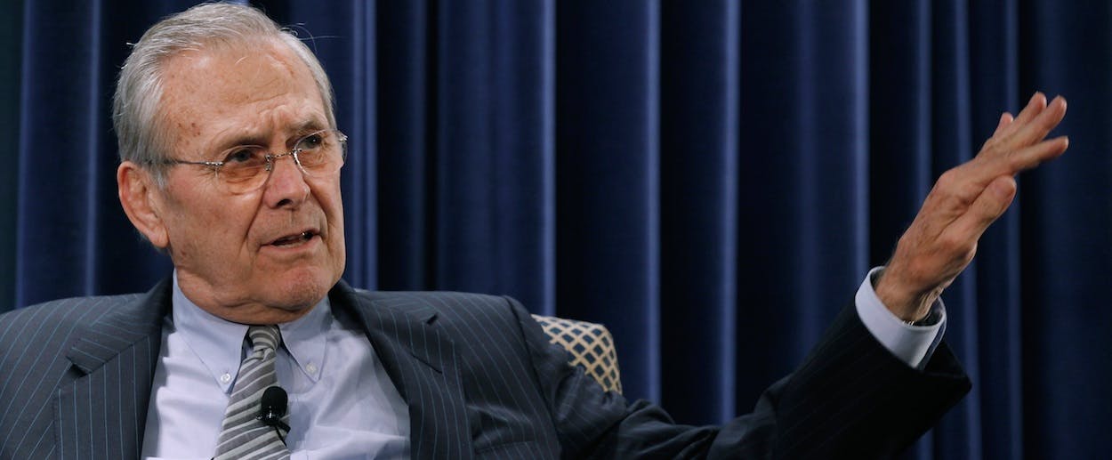 It’s not that Rumsfeld lacks intelligence, or the youthful edge that will spar with questioners and revel in scoring points. He has the exuberance and the shallow fierceness that could lead Boy Scouts out of the wilderness, back to camp, telling stories over hot cocoa. (He holds the Distinguished Eagle Scout Award as well as the Presidential Medal of Freedom.) He is a winner and winners don’t apologize, because they take care to guard their confidence. “Don’t apologize,” said John Wayne. “It’s a sign of weakness.” Fog, agony, distress, and so on were not Rummy’s burden: He entered into most problems with his mind made up. As the Duke of Wellington might have said, “I don’t know what he does to the enemy, but he frightens me.”