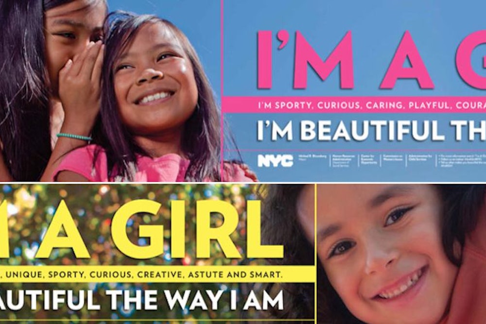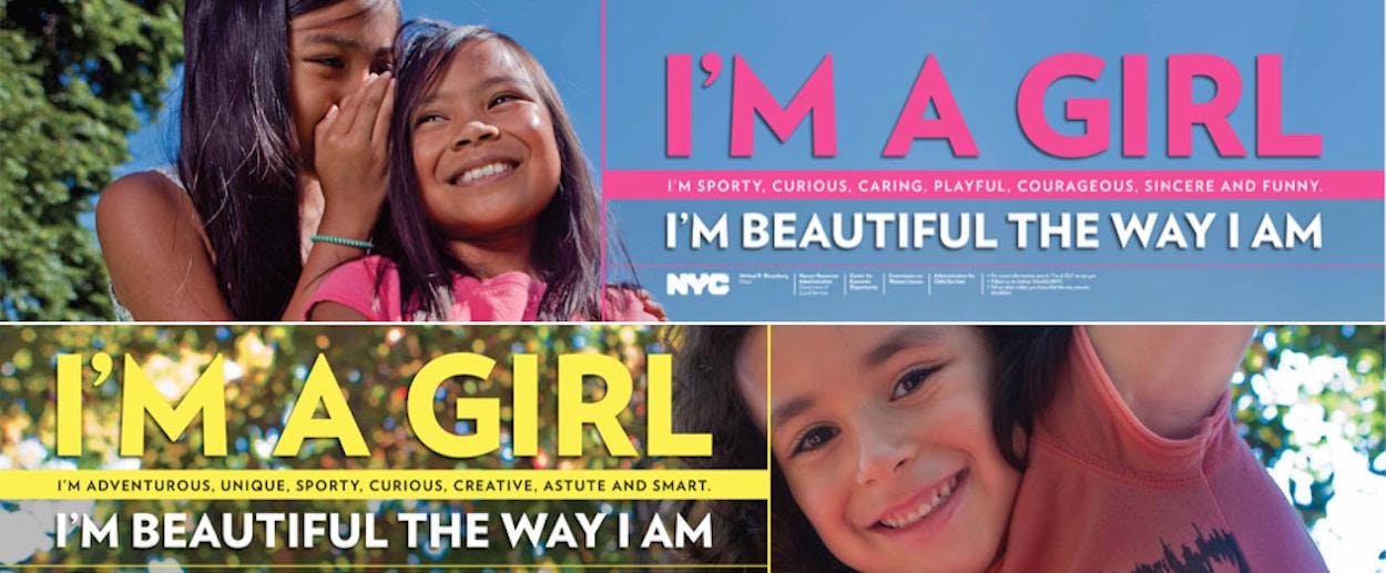 In what may be one of his last hurrahs as mayor of New York, Michael Bloomberg on Monday unveiled a campaign that aims to bolster young girls’ self-esteem by telling them they’re beautiful the way they are. The $330,000 public health campaign, “NYC Girls Project,” has deployed bus and subway ads around the city depicting girls of different sizes and races and featuring slogans like, “I’m a girl. I’m a leader, adventurous, outgoing, sporty, unique, smart and strong. I’m beautiful the way I am.”