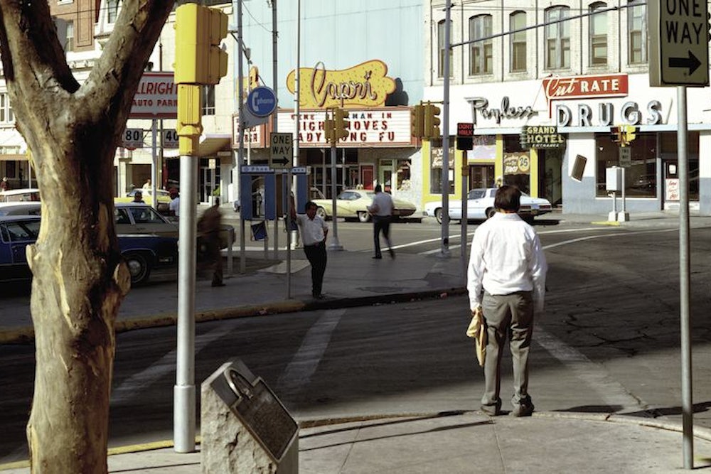 Shore’s camera no longer pointed at a single thing—a building, a bed, a toilet. His photos no longer felt like peepholes into his life. Tillman has described the photos of Uncommon Places as expressing a “willed objectivity.” The 8x10 opened the photograph up; they were vast, impersonal spaces, as though a viewer might wander into them and claim it for herself. In one photo of a street intersection in El Paso, a man standing on a corner in the foreground seems to have done exactly that.