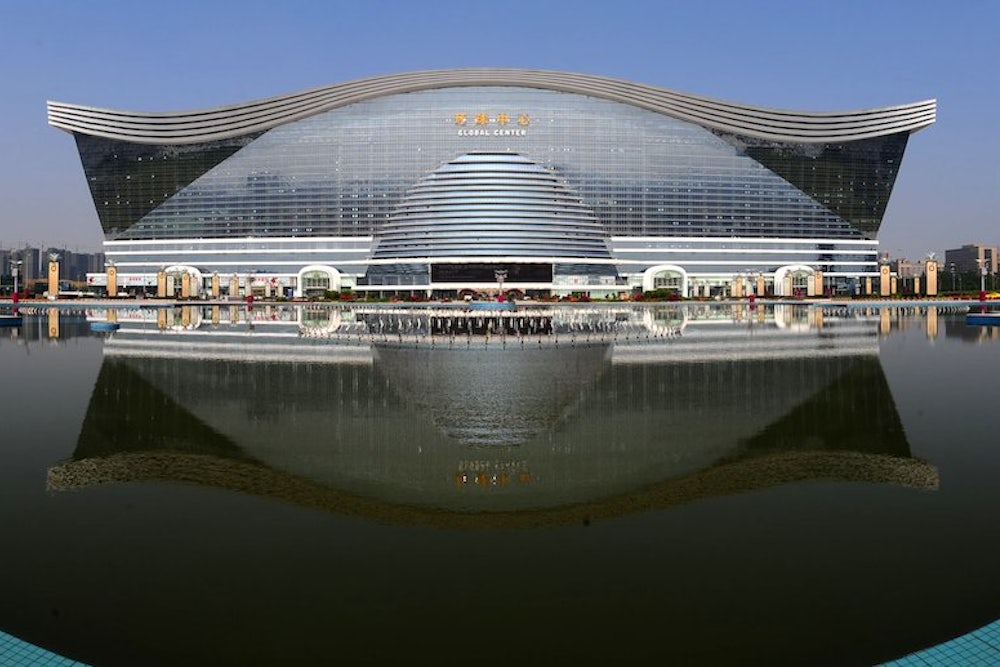 I wanted to swallow it whole. I therefore set aside a full day to experience as much of the Global Center as I could, to browse its wares, to float in its waters, to ride its escalators and skate its rinks, to get to know each of its 1,700,000 square meters—a maximalist approach to a maximalist structure. The Center invites absurd size comparisons: News reports tell us it could fit 20 Sydney Opera Houses, four Vaticans, or three Pentagons. The Center is also, along with a raft of business conventions and a railway line to Poland, part of Chengdu’s bid for top-tier city status. (It’s China’s seventh-largest city by population, and lacks the name recognition of Beijing, Shanghai, and Guangzhou.) Still, I wanted to know: Why? Building the largest free-standing structure in the world is impressive, but not quite as inspiring as building the tallest. It’s like setting the world record for fastest 100-meter power walk. Then again, of course the largest building in the world is now Chinese; it’s strange that it wasn’t before. What, if anything, does this latest entry into the eyesore arms race say about Chengdu—and about China?