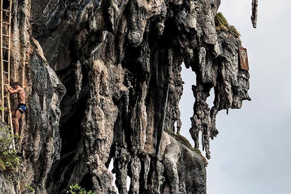 It was taken during the Red Bull Cliff Diving World Series in Thailand, but I would ask you, for the moment, to ignore the thing—the diver—that makes it heart-stoppingly beautiful. Look, instead, at the rocks. I’ve forgotten almost everything I learned in school about geomorphology so am unsure of the processes that formed these implausibly CGI-looking cliffs. But gravity must have done its bit. The other diver making his way precariously up ladders clinging tightly to the cliffs—so tightly as to make us more than a little admiring of the unseen people who fixed them there in the first place—is at odds with the overwhelming direction of the picture which is, in a word, down. Heraclitus’s claim that the way up and the way down are one and the same has always seemed a bit daft—and now we have the photographic evidence to prove it. The reason it looks so dangerous, so easy to fall from these rocks, is because they appear to have taken several million years to resist the urge themselves. Wind and erosion may have played a part but these cliffs look like they began as molten lava, which, once poured, then dripped into the sea, before solidifying like wax on the side of a candle.