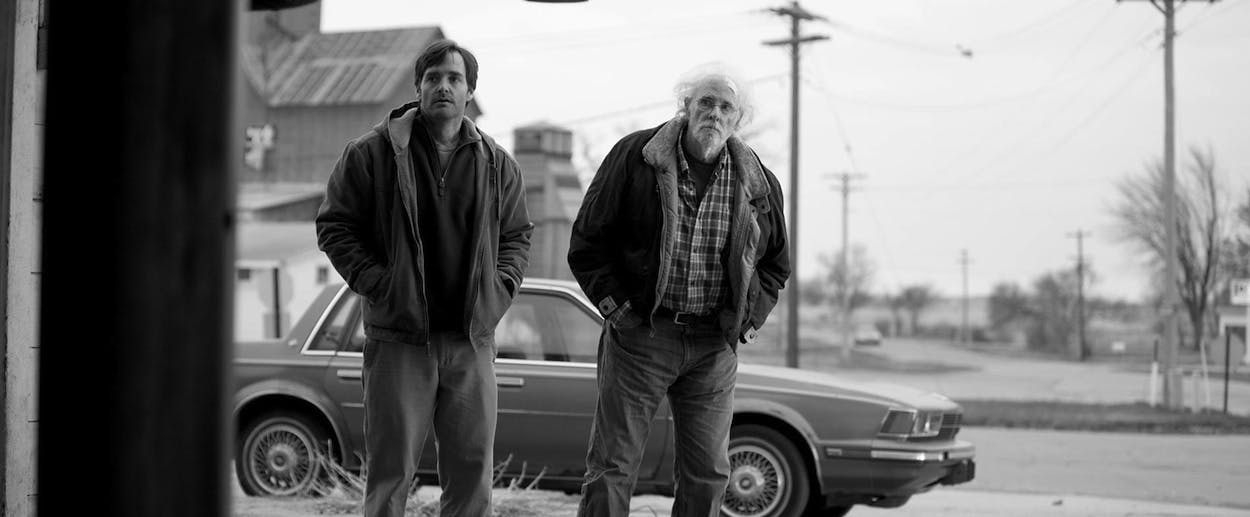 In parched black and white, this is the story of how Woody Grant (Bruce Dern), a grump in Billings, Montana, receives a glib sweepstakes letter and elects to believe he has won $1 million. So he gets his son (Will Forte) to take him to Nebraska where the prize waits to be collected. The son knows the bonanza is flim-flam but he makes the trip, if only to attempt a kind of bond with his father. Short of their destination, Lincoln, they find the part of Nebraska where Woody lived once and where his major creditors are gathered and waiting.