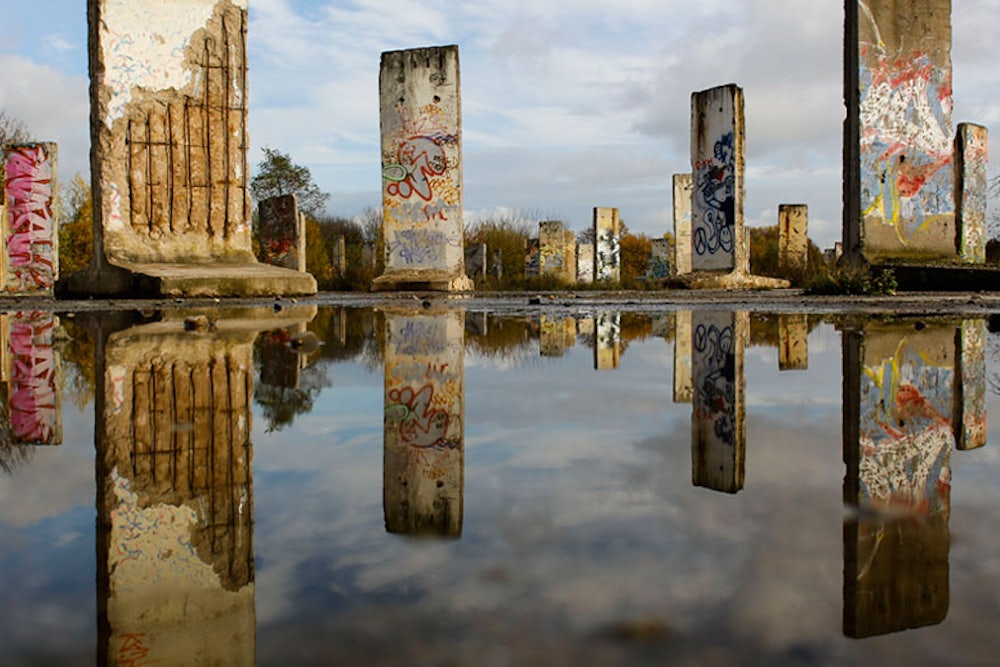 I felt the same way after seeing the film Over Your Cities Grass Will Grow about German artist Anselm Kiefer’s vast studio complex in rural France, its misty landscape scattered with desolate sculptural towers that look like fragments of—and memorials to—some unspecified yet insistently suggested catastrophe. But this photograph, which seemed initially the souvenir of an experience one had missed out on, stakes its claim on our attention more stubbornly. By dividing the picture precisely between real things—sky, trees, wall—and their mirror images in the water, the photographer prompts us to reflect on landscape and its representation. Perhaps the allure of the place derives from the way that this image of it contains traces of earlier scenes. The bare tree glimpsed between the fragments of wall on the far right, in the deep background, does not just take us vaguely back to memories of German Romanticism; it is practically sampled from paintings by Caspar David Friedrich. This makes the fragments seem even older, like Stonehenge or the Standing Stones of Callanish: stark and elemental expressions of some primal connection between the land and the spirit before the advent of civilization.