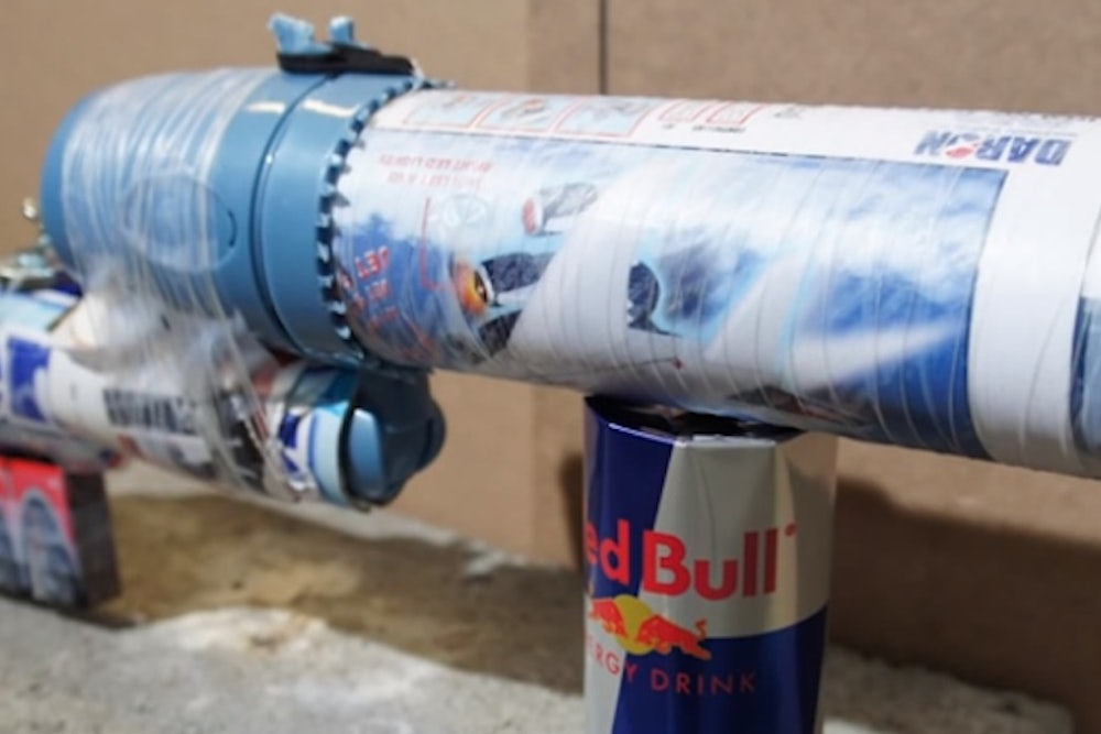 A battery in the “gun” runs an electric current through a piece of wire when the trigger is pulled, melting the condom with heat. The water from the condom mixes with the lithium, and that reaction heats up the deodorant can so quickly that it explodes, forcing the “shot” - in this case, pennies - out of the rolled-up magazine barrel.