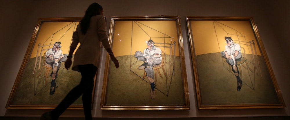 If you can believe all the hand-wringing and soul-searching these days among artists, art critics, and sundry other arts professionals, you’d imagine that nobody is really happy about the $142.4 million paid for a Francis Bacon triptych at Christie’s the other day—or the $58.4 million for a Jeff Koons at the same auction or the $104.5 million for a Warhol at Sotheby’s the following night. Those prices are as repellent as Leonardo DiCaprio’s baronial frat house shenanigans in the coming attractions for Martin Scorsese’s new tale of Gilded Age excess, The Wolf of Wall Street. Among the most revolting sports favored by the super-rich is the devaluation of any reasonable sense of value. At Christie’s and Sotheby’s some of the wealthiest members of society, the people who can’t believe in anything until it’s been monetized, are trashing one of our last hopes for transcendence. They don’t know the difference between avidity and avarice. Why drink an excellent $30 or $50 bottle of wine when you can pour a $500 or $1000 bottle down your throat? Why buy a magnificent $20,000 or $1 million painting when you can spend $50 or $100 million and really impress friends and enemies alike?