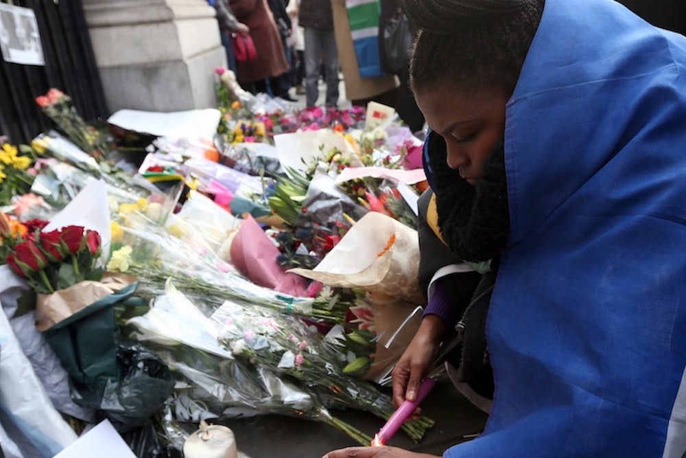 At Mandela’s home in a leafy suburb called Houghton Estate, the crowd that had come to leave flowers and gawk over a police tape at the train of official mourners arriving at the Mandela door was a little larger, but not huge, and in several hours there I saw no visible grief. There was a sort of carnival atmosphere, with small circles of singers and dancers, one group, rather mystifyingly, hoisting the flag of the Democratic Republic of the Congo. A man hawked baseball caps with a picture of Che Guevara. A group of politicians beyond the police tape gave each other bear hugs and guffawed at something inaudible. Over by the shrine of flowers building up at the house’s corner, everybody who laid a bouquet wanted their photo taken. They all smiled. Some flashed the peace sign, as though they were at the Statue of Liberty. Lone among the crowd, a little boy wailed. His father promised him something to eat, and he quieted. Two fabulously coiffed ladies in stiletto heels tottered under an outrageously large bouquet quilled with signs advertising its corporate provenance: “From SCIP Engineering.” “Fix it so you can see the logo,” one woman hissed to the other as they set it down. Another woman in Mary-Kate Olsen sunglasses instructed her iPhone-wielding husband how to capture the moment she lay down her bouquet: "I want video. I want Instagram. I want everything!"