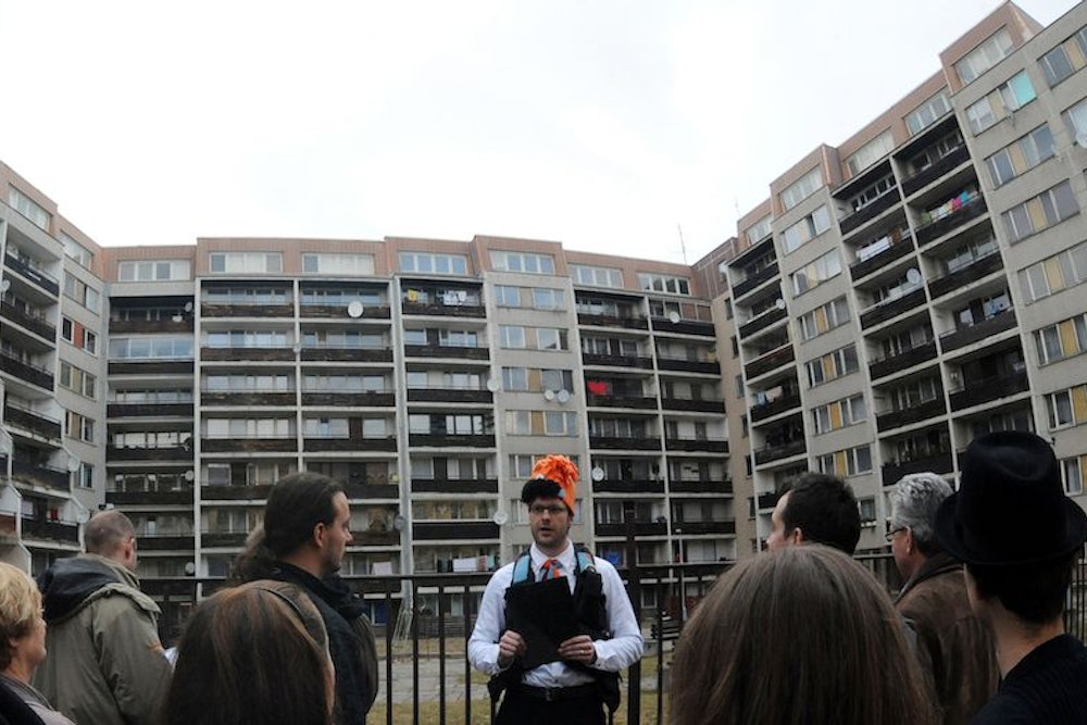 The tour I went on was in Czech, so almost everyone was Czech (though there was also a Canadian guy). At the first stop on a Crony Safari–where the guide deploys an ornithology motif—nearly two dozen tourists stood in front of a drab, prefabricated, apartment block, the kind that became ubiquitous during communism. The guide tells his fellow “bird-watchers” that one of Prague's “crows” has a secondary nest here, and that his primary nesting place in Prague is unknown, though rumored to be palatial.