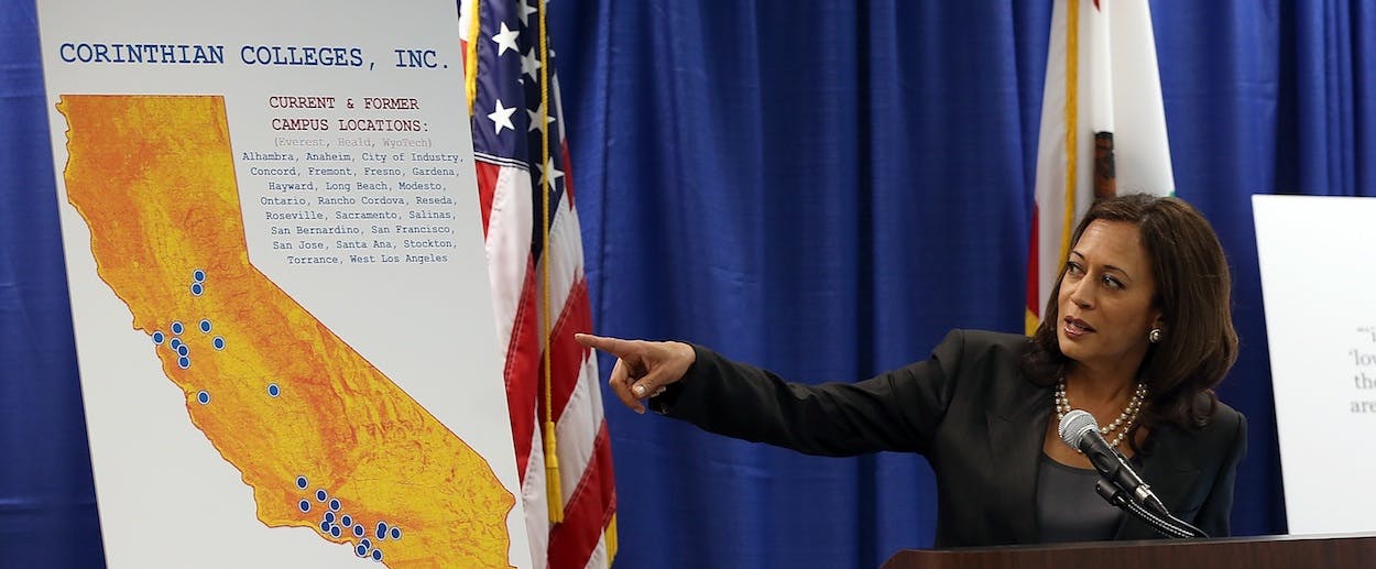 The events that occurred in the summer of 2007 may seem like ancient history. But judging by a new lawsuit that Brown’s successor as AG, Kamala D. Harris, filed against Corinthian in October, the company’s practices don’t seem to have changed. The lawsuit accuses the company of deliberately misleading prospective students and investors about its success in placing students into jobs. In a press release announcing the suit, Harris’s office wrote that Corinthian “advertised job placement rates as high as 100 percent for specific programs when, in some cases, there is no evidence that a single student obtained a job during the specified time frame.”
