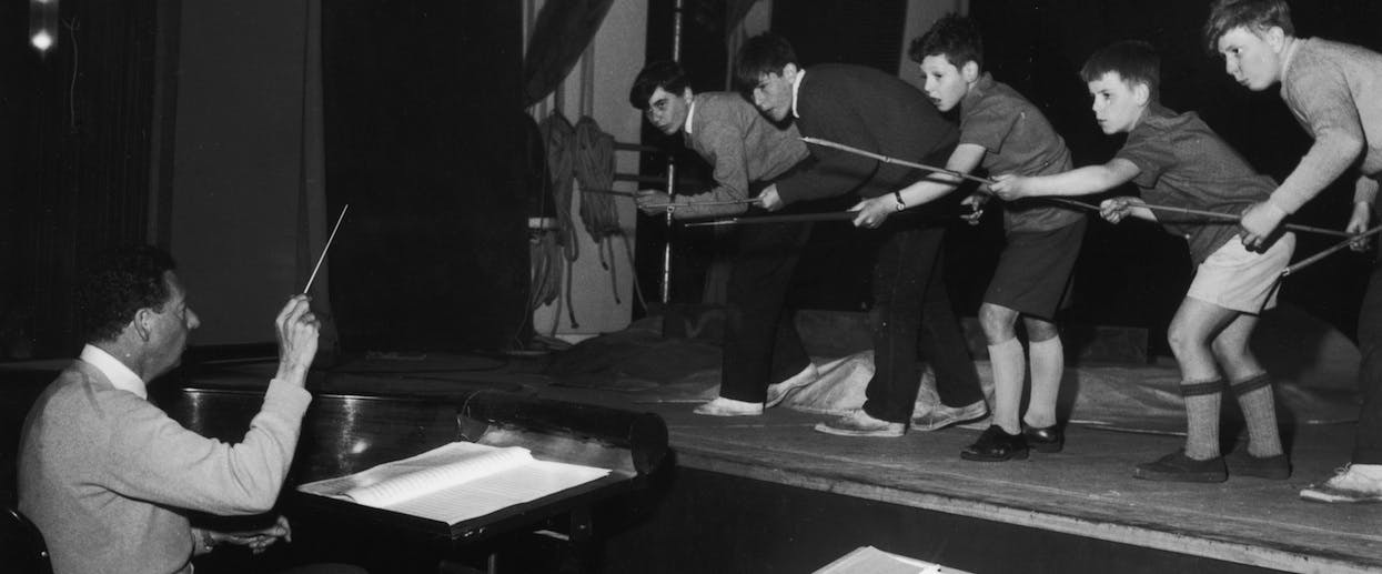 No matter what the young composer may have said about sentimental “slop,” Britten indulged it the way most people regulate their intake of fatty food and hard liquor. And he never seems quite as genial as on those rare occasions, as in Albert Herring, when he takes a second martini. He may have distanced himself from the taste for folk song, yet he was accomplished at writing off-kilter, slightly alienated folk-song pastiche, which is often the best thing to be found in his work. In the operas, the music that in film would be termed “diagetic”—the sailors’ cries of “O heave, o heave-away heave” in Billy Budd or the chorus of young men singing “Serenissima” in Death in Venice—are not only among the most memorable moments, but often some of the most musically generative material, recurring as thematic DNA far from their original context.