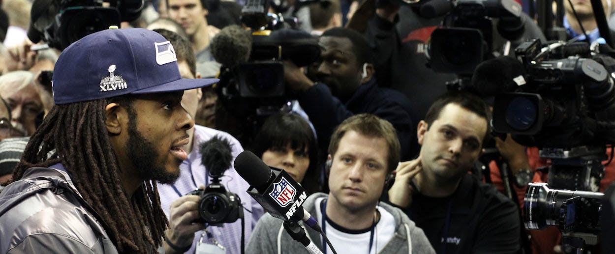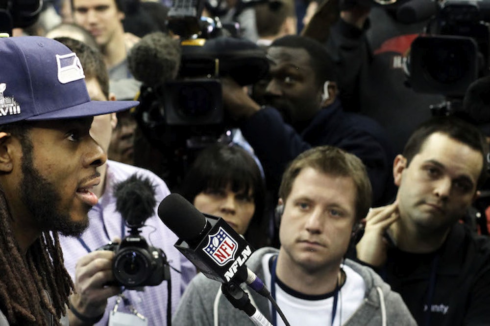 But I have just returned from this year’s Media Day at Newark’s Prudential Center (home of hockey’s New Jersey Devils), and the chief privileges of attending turn out to be bitterness, several wasted hours, and coffee breath. Seattle Seahawks running back Marshawn Lynch had the right idea. He was the only major player to refuse, apparently, his own podium (18 players from each team get their own individual podium, all of which are mobbed by reporters). Lynch did show up, presumably in order to avoid a massive fine. “Shawn’s a good guy, he just doesn’t like talking to the media,” explained Seahawks defensive end Cliff Avril to me and more than a dozen other reporters huddled around him. For his part, Lynch managed this quote to NFL Network’s Deion Sanders: “I’m just ‘bout that action, boss.” Me too, man.