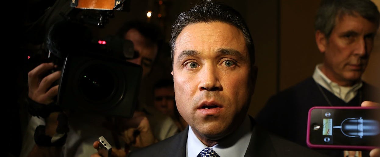 When NY1 reporter Michael Scotto tried to ask Michael Grimm, a Republican congressman from Staten Island, about his campaign finance troubles in an interview after Tuesday's State of the Union address, he found his manhood challenged. Grimm, a Marine Corps vet and a former FBI agent, said, “Let me be clear to you, you ever do that to me again I’ll throw you off this fucking balcony,” and later added, “No, no, you’re not man enough. You're not man enough. I’ll break you in half. Like a boy.”