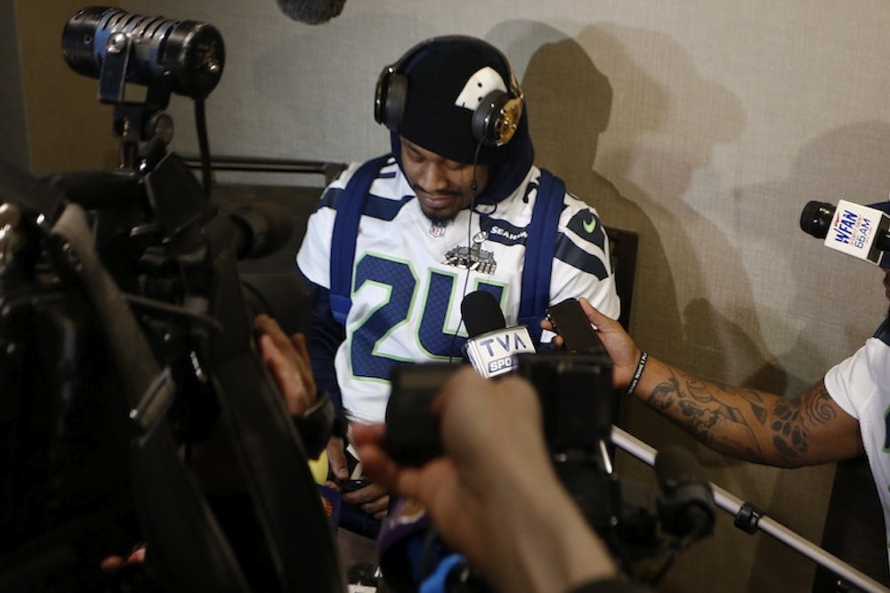Seattle Seahawks running back Marshawn Lynch doesn’t like to talk to press. For his lack of availability throughout the season, the National Football League imposed a suspended $5,000 fine; when he said he did not want to participate in Tuesday’s (pointless, insipid) Media Day, the league threatened to enact that fine and levy an additional $50,000. So he came, albeit without a podium, took questions for a few minutes, and did a brief interview with NFL Network. On Wednesday, at another mandatory availability, Lynch lasted about as long before climbing over chairs and escaping his pursuers with the skillful aplomb we’ve come to know.