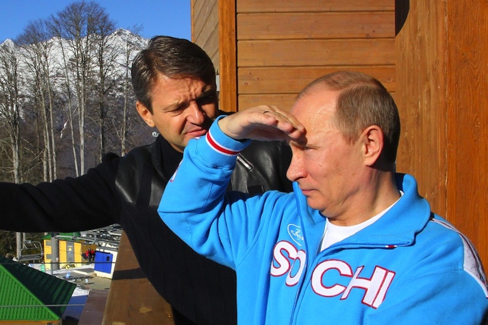 Russian President Vladimir Putin has been visiting Sochi a lot in recent months as it prepares for the 2014 Winter Olympics. His frequent presence there has not had the desired effect: The subtropical city seems far from ready for the games, which begin Friday. Maybe that's because he spent too much time playing hockey, drinking champagne, and hanging out with leopard cubs, when he should have been cracking down on corrupt construction projects. But, like a good strongman must, he has at least been photographed inspecting all manner of Olympic infrastructure in the city. Unlike another despot known for looking at things, though, Putin's gaze always seems to fall on objects off-camera. Below are some theories as to what he might be staring at.