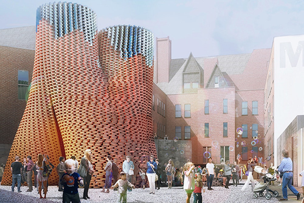 The two-storey towers, to be built in the outside space at MoMA's PS1 venue in Long Island City, will use two kinds of brick. From the bottom until most of the way up the top the bricks will be made of a mixture of corn husk (a common agricultural waste product) and mycelium; at the top, there will be rows of bricks that are covered in a reflective film. After the tower is built, sunlight will be directed onto the fungal bricks below by the reflective bricks above, encouraging them to grow faster.