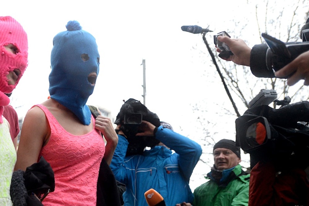 The girls, meanwhile, were giving a press conference. “At the moment this city is under occupation, under police control,” one of the artists, a girl in a blue balaclava and hot pink dress, said.