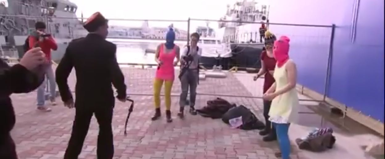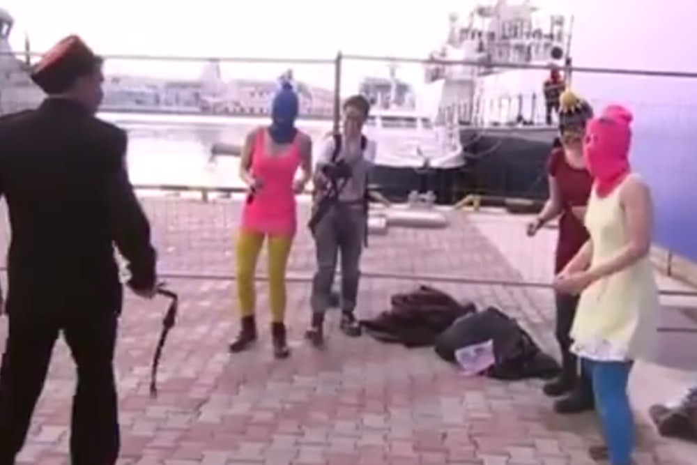 This afternoon, when the ladies tried to film video for their new song "Putin Will Teach You to Love the Motherland" by the Sochi marina, Cossacks whipped them. Literally. Whipped them. With whips.