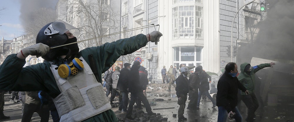 What's been happening in Kiev this winter is a textbook case. Protesters came out to the Maidan to show their opposition against Yanukovich (once again). Despite the cold, they didn't go home. They were peaceful, but only at first. The police tried to clear the Maidan, but didn't use enough force to finish the job. This brought out more protesters and, this time, they began to set up camp—and barricades. They turned the city's main square, a stadium, and one of its main streets into a war zone. They took over government buildings. The more Yanukovich negotiated with them, the more the negotiations chipped away at his legitimacy and his power.