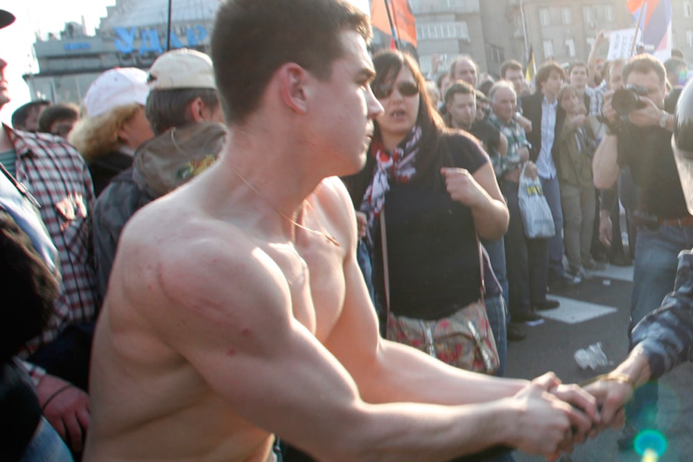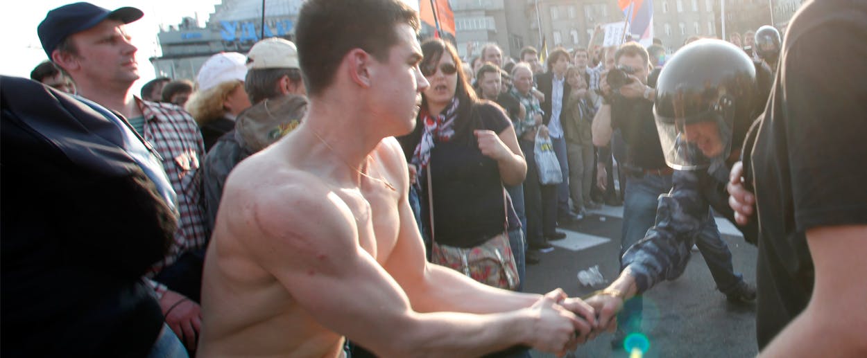 During the Bolotnaya rally, the cops had grabbed Denis Lutskevich, then a 20-year-old former marine, tearing off his shirt as he tried to get away. There is a famous picture of him from that day, shirtless in khaki shorts, his back a canvas of red welts. One of the cops claimed Lutskevich had tried to pull his helmet off, and for this, he was facing eight years in jail, plus an additional five for participating in mass riots.