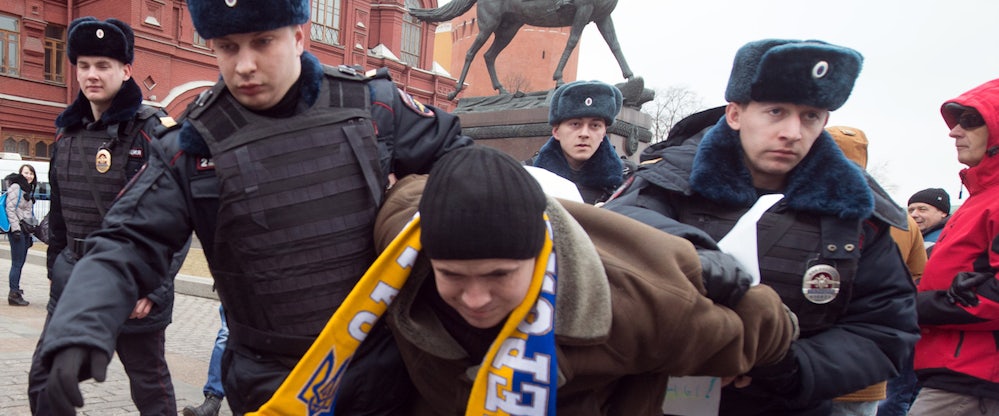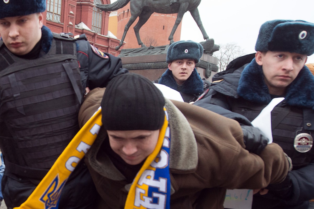 — Владимир Варфоломеев (@Varfolomeev) March 2, 2014Police break up anti-war demo in #moscow # Russia. Outside ministry of defence. Few hundred people pic.twitter.com/HFG5WVYDr2