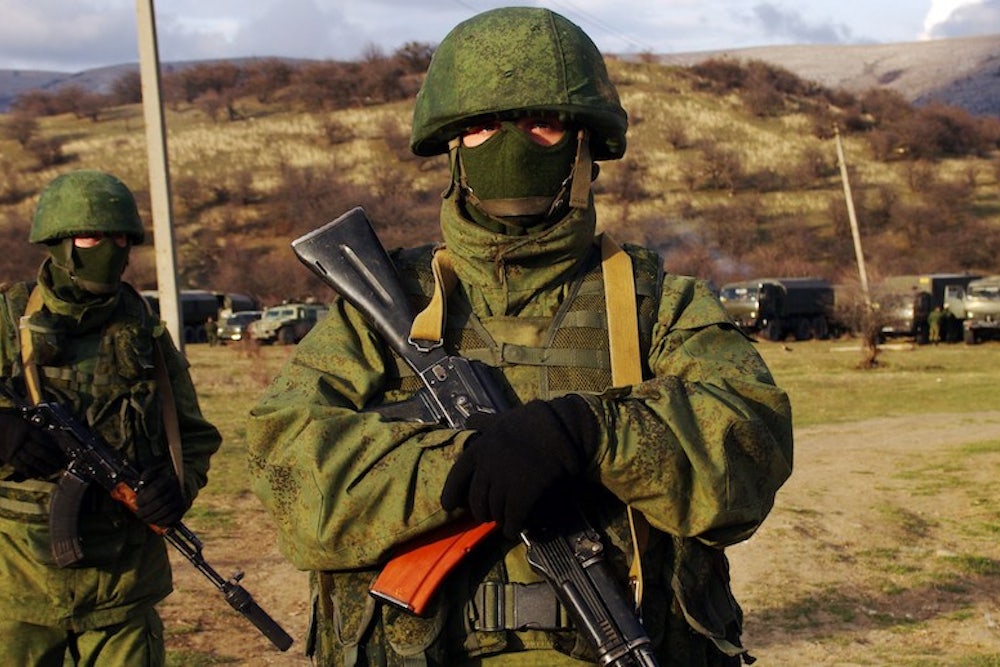 The "local defense forces" currently occupying Crimea are wearing unmarked uniforms that look a hell of a lot like the ones that Russian designer Valentin Yudashkin made for the Russian army. They're carrying Kalashnikovs and Russian Dragunov sniper rifles, RGD-5 grenades, and NSV machine guns. They're riding around in Russian "Tiger" and "Lynx" armored cars. And yet, according to the Kremlin, they do not exist.