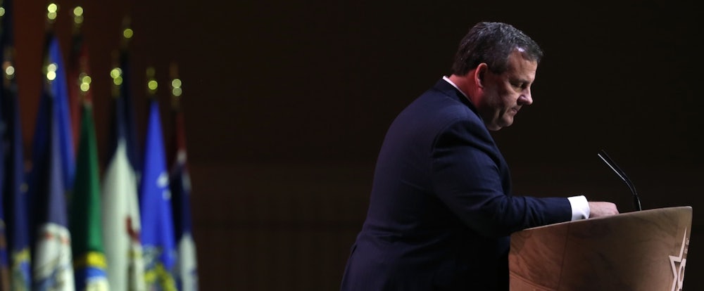 What was going to set Christie apart was his pure verve, and it’s the verve that was so lacking today. Even his concessions to the crowd were veiled and halfhearted, like his defense of the Koch Brothers, whom he hailed opaquely without actually naming them: “two American entrepreneurs ... great Americans creating great things in our country.” He dutifully ticked through praise of other Republican governors—his mention of Wisconsin’s Scott Walker got more applause than just about anything else he said, and his mention of Michigan’s Rick Snyder included praise for Snyder’s passage of anti-union right-to-work legislation in Michigan. That last one was eyebrow-raising given that Christie has opposed similar legislation in New Jersey and has cultivated crucial bonds with private-sector unions. One couldn’t help but wonder whether he would’ve felt it necessary to praise right-to-work laws as a way to ingratiate himself with the crowd if he had been freer to ingratiate himself with his belligerent charm.