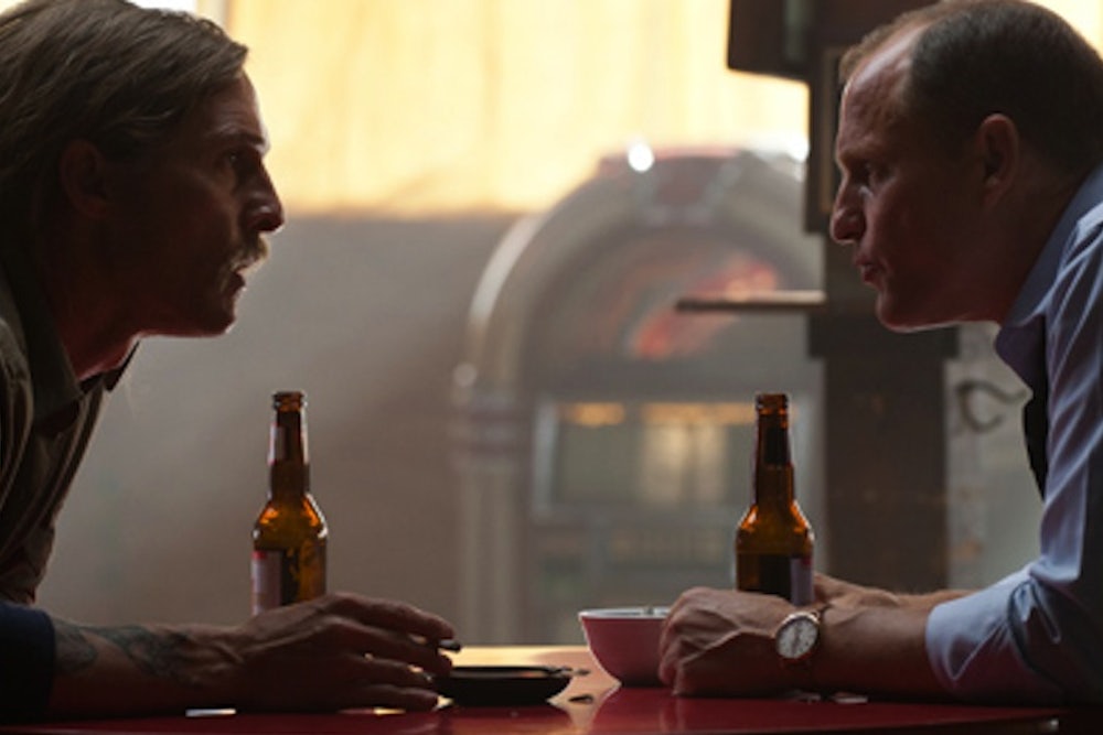 But then think of the wasted Cohle at the interrogation table, smoking, drinking, blueskying, and making totem figures from the beer-can metal. That man is mesmerizing, and so dangerous you feel grateful that he’s on TV with two cops—moreover, two black cops, his Rosencrantz and Guildernstern. I don’t know if Rust will be alive at the end (or if he ever was), but he could be the distillery cooking the film’s ghostly brew. He might have placed that first corpse, the naked woman bent over, antlers on her head and a crude spiral drawn on her back.