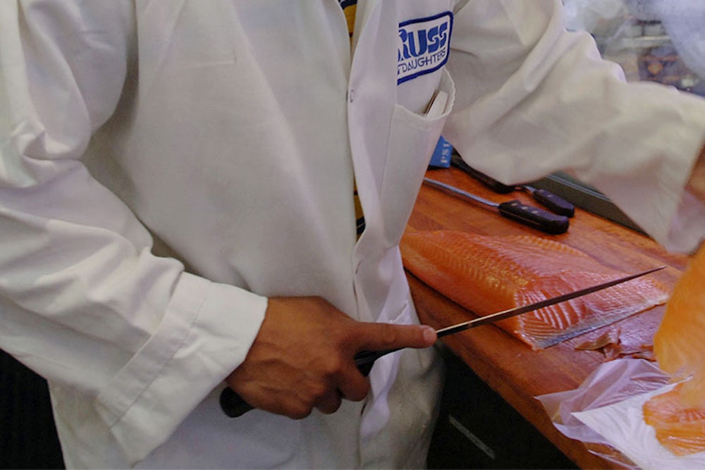But Vargas and Reyes were great lox slicers, and they had ears for Yiddish. Soon, the customers were calling Vargas “boychik” and the journalist Calvin Trillin, who had often written about Russ & Daughters for his New Yorker column, created a character, “Herman, the artistic slicer,” in his novel Tepper Isn’t Going Out: “They say they can read the Times through one of Herman’s slices,” Trillin wrote.