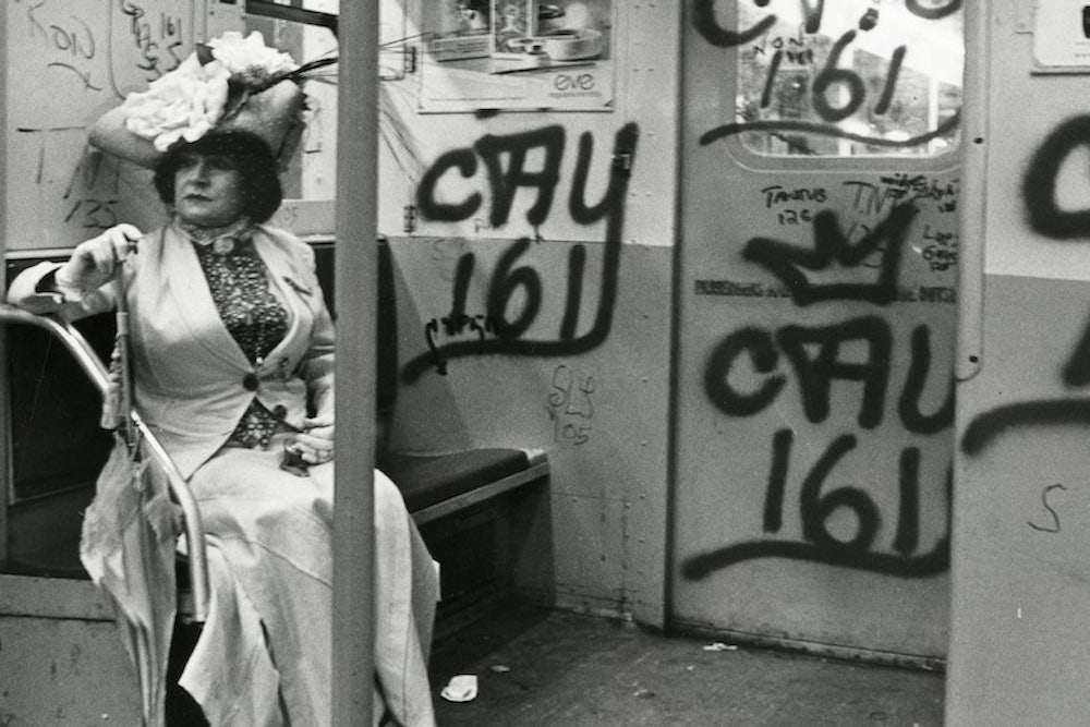 Cunningham is the subject of a new exhibition at the New-York Historical Society, and if you only know him as a street photographer it may take you by surprise. Bill Cunningham: Facades presents 80 posed images, shot from 1968 to 1976, that place models dressed in period costumes, from corseted gowns to Enlightenment-era coats and breeches, against the backdrop of the contemporary city. Many feature his muse Editta Sherman—the so-called “Duchess of Carnegie Hall,” who died last year at 101 and who, like Cunningham, had lived in an apartment above the hall before being forced out due to redevelopment—and one in particular endures. Sherman, wearing a huge Edwardian hat and carrying a parasol in her gloved hand, sits alone in a subway car, the walls festooned with graffiti. Someone called Cay 161 (one of the “161 Boys,” a crew from the South Bronx) has tagged the car four times; other, smaller tags garland the carriage, and the floor is filthy. Also dating the image: a cigarette advertisement, which the Metropolitan Transit Authority banned in 1992.