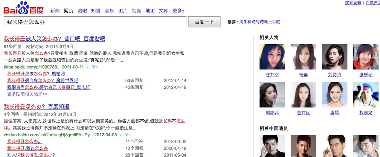 Physical appearance is another perennial source of anxiety. Men search for ways to “grow taller” and “cure baldness,” while women ask how to “make my skin white,” “make my legs thinner,” and “make my face thinner.” “Am I handsome?” is the most common search about users’ appearance, followed by “I’m ugly,” “I’m very ugly,” and “What do I do if I’m ugly?” Insult to injury, the search results page is populated with photos of beautiful celebrities.