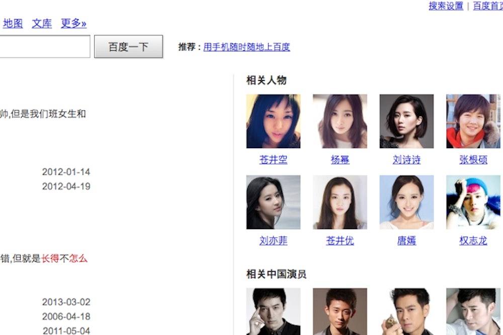 Baidu users appear to be hopeless media addicts. A big chunk of search suggestions turn out to be titles of songs, movies, and TV shows, many of which users can stream online. Type in “I am,” and the suggestion box fills with variations on the talent show title “I Am a Singer.” Type “who,” and you are directed to the dating show “Who Can Be One in a Hundred?”, the talk show “Who’s Talking?”, the video game “Who’s the Mole?”, the movie Unexpected Love(its Chinese title translates as “Who Says We Can’t Love?”), the movie “Who Is the Real Hero?”, and the novel “Who Didn’t Have an Aimless Youth?” Baidu also suggests that users might be looking for the recent ad campaign “Who Can Represent KFC?” According to a spokesman for Baidu, there is no commercial element in the suggested search terms.