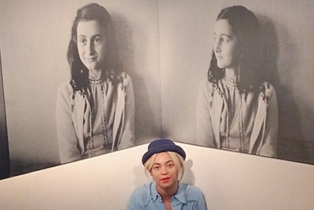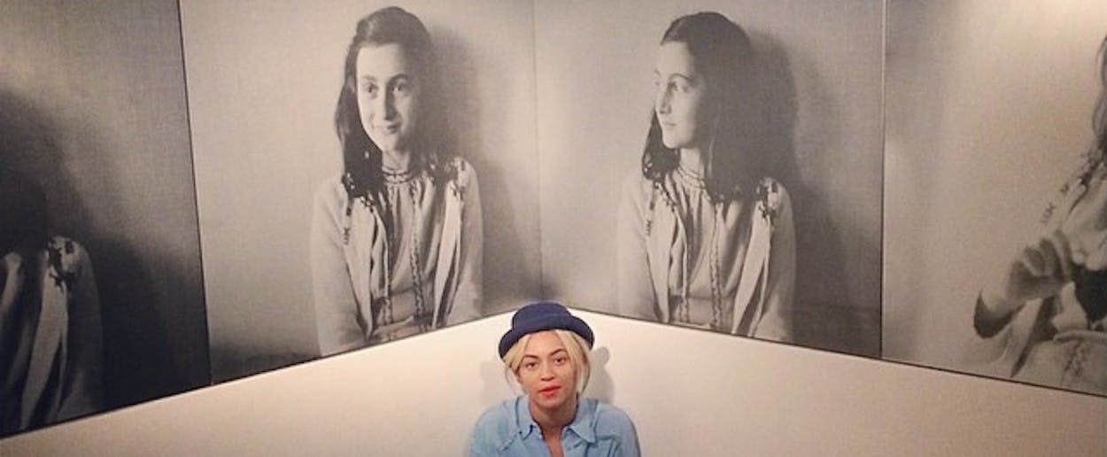 The Anne Frank House's last brush with pop fame came when Justin Bieber visited a year ago and wrote in the guest book, “Truly inspiring to be able to come here. Anne was a great girl. Hopefully she would have been a belieber.” Outrage ensued. This was justified, if eliding the fact that Frank—a generally typical, if extremely gifted, teenage girl—may well have been a “belieber.” And one can imagine a similar response to this picture. It is bewildering, even disturbing, to see Beyoncé putting on a sad-face because the topic, for an hour, was the Holocaust.