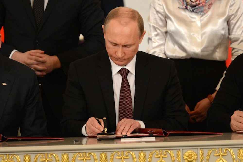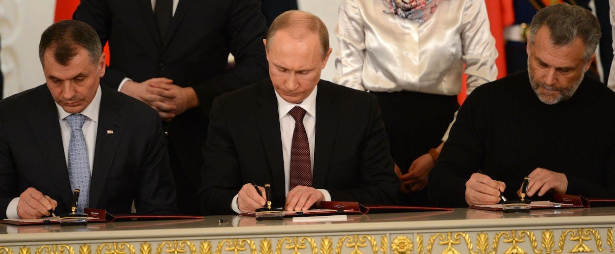 Putin ratified the Russian parliament’s treaty to annex Crimea and Sevastopol on Friday morning in the presence of parliament leaders in the Kremlin’s elaborate Catherine Hall. “I want to congratulate you, citizens of the Russian Federation and the inhabitants of the Crimea and Sevastopol on this momentous event,” Putin said before signing the treaty. He also appointed an ambassador to represent the Kremlin in the “Crimean Federal District.” There were celebratory fireworks in Moscow, Simferopol, and Sevastopol today.