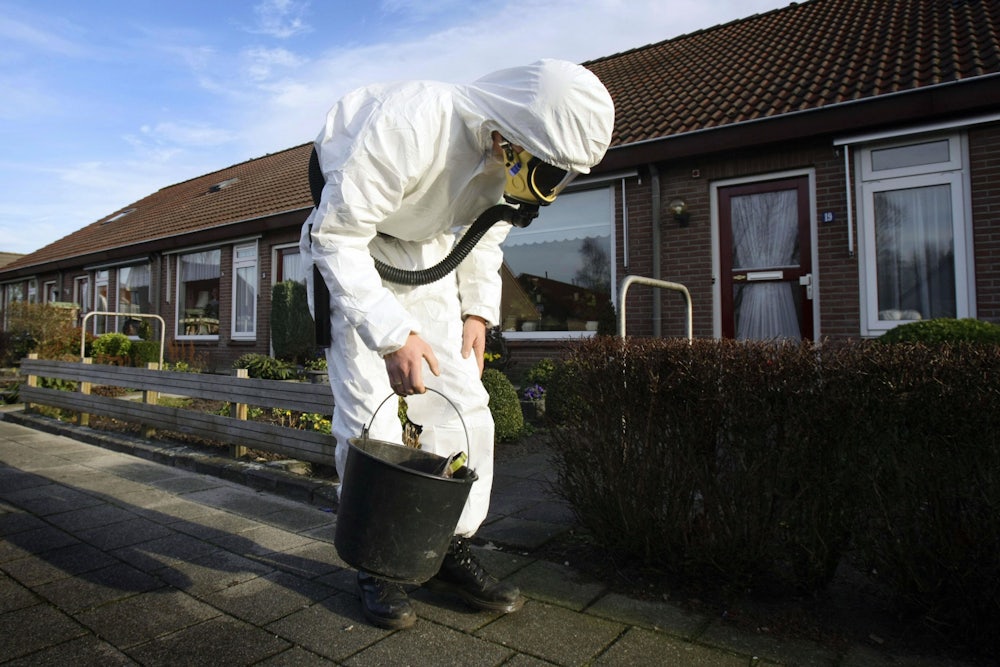 It might look like a scene from a horror movie in which scientists fight to contain a virus, but the truth is more banal—though no less deadly. The two men are removing asbestos insulation from a heating pipe in a west London hospital.