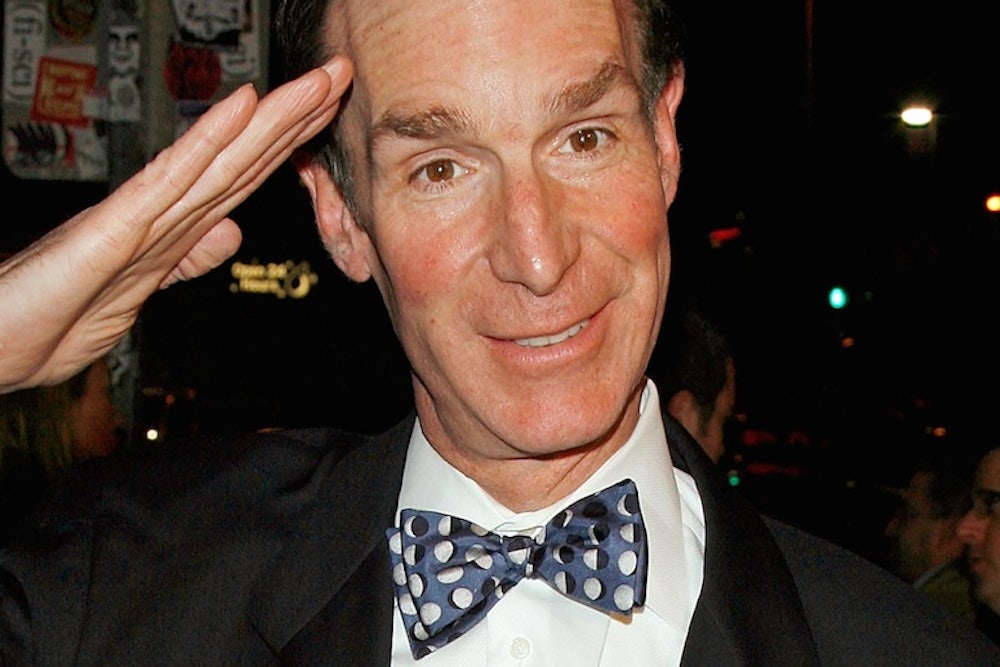 Bill Nye calls his new life as a political pundit a “patriotism.” It’s a war he probably won’t win. If the Intergovernmental Panel on Climate Change can’t convince the diehard climate-change deniers, the Science Guy probably doesn’t stand a chance. But his performance so far hasn’t disappointed, and that’s exactly the point: It’s a performance. That may be exactly what the rational side, exhausted from years of outrage and alarm, needs today. If the deniers cannot be reasoned with like adults, then at least let’s be entertained by the dismantling of their arguments and exposure of their ignorance—if only to make us laugh, and thereby preserve our sanity. And given that reasoning, who better to debate these intransigent skeptics than an impossibly patient ex-comedian who not only made science fun for children, but made their parents laugh, too?