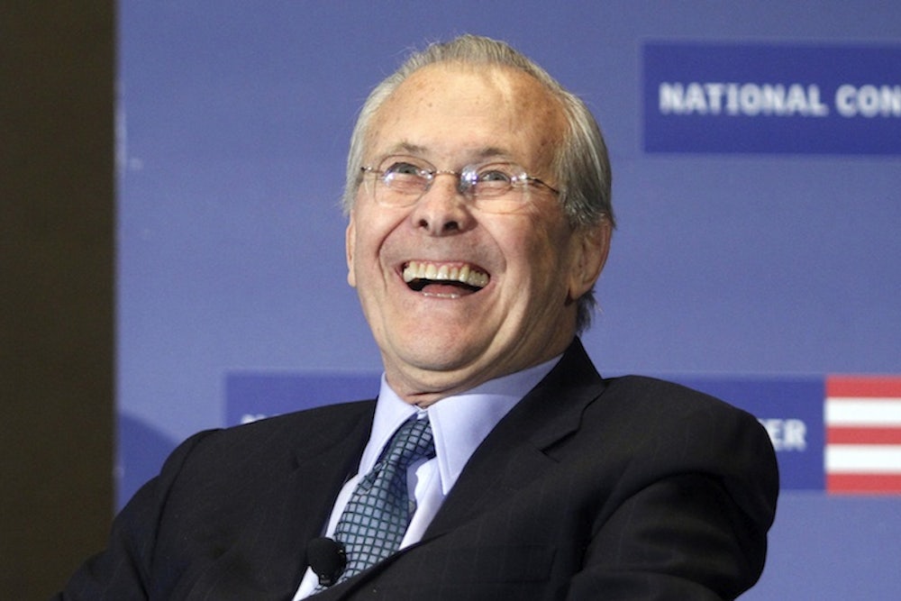What to make of someone who creates mistakes of this magnitude and escapes regret? Errol Morris, whose documentary of Rumsfeld, The Unknown Known, opens this week, tries to explain the puzzle through interviewing Rumsfeld and examining his memos as secretary of defense. The logic behind Morris’s approach, that analyzing Rumsfeld’s words will provide a key into the man, is a watered-down form of textual analysis that’s become a staple of political writing. For exemplars of the genre like Bob Woodward and Mark Halperin, as well as Rumsfeld’s biographer Bradley Graham, politics is personal rather than sociological, a matter of the actions of individuals rather than larger historical and cultural forces. What this approach leaves Morris with is a highly sentimentalized portrait: Rumsfeld as an outsized villain, whose career arc is characterized by the all-purpose word “ambition” and whose decisions and motivations remain largely opaque. “I fear I know less about the origins of the Iraq war than when I started,” Morris writes in The New York Times. To Prospect Magazine, he acknowledges that “I did like [Rumsfeld] and I am appalled and frightened by him. His unbelievable narcissism, vanity, I don’t even know how I would describe it.” To Rolling Stone, he describes his documentary as a “horror movie” and says that Rumsfeld is “untouched by history.”