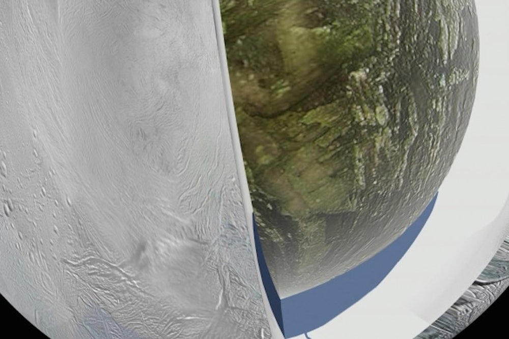 Astronomers have discovered evidence for a large liquid water ocean beneath the surface of Enceladus, Saturn's unusual, ice-clad moon that's only one-seventh as large as our Moon. This makes it perhaps an even better candidate for extraterrestrial life than Jupiter's moon Europa, the other possible candidate in the Solar System.