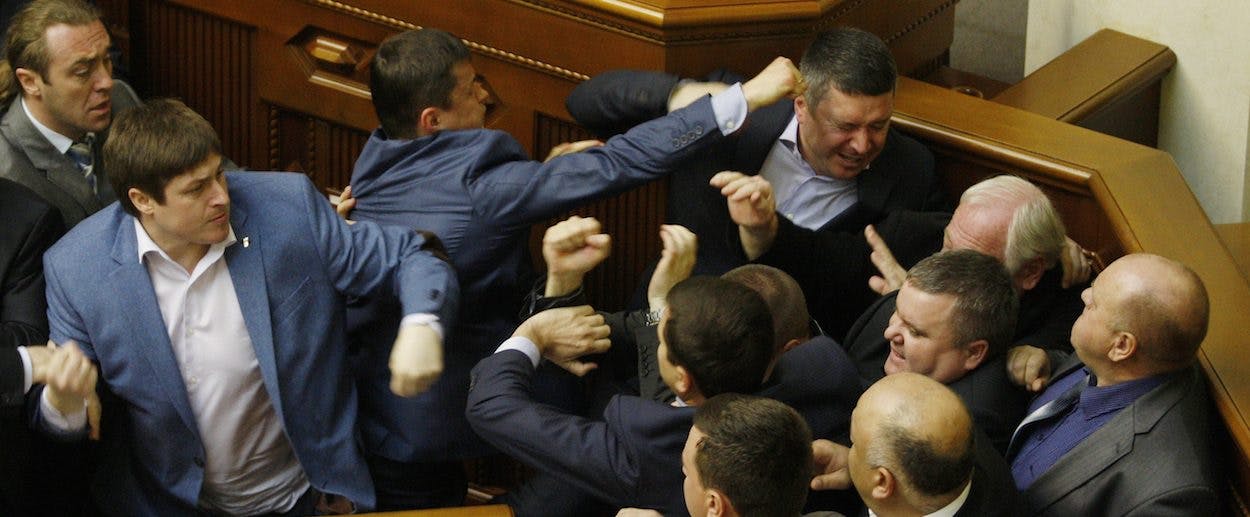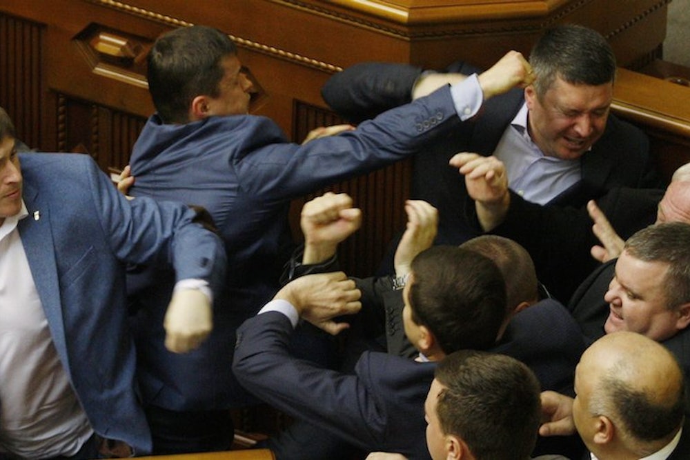 This morning a fist fight broke out on the floor of the Ukrainian parliament after Communist Party Leader Petro Symonenko said the government had divided Ukraine.
