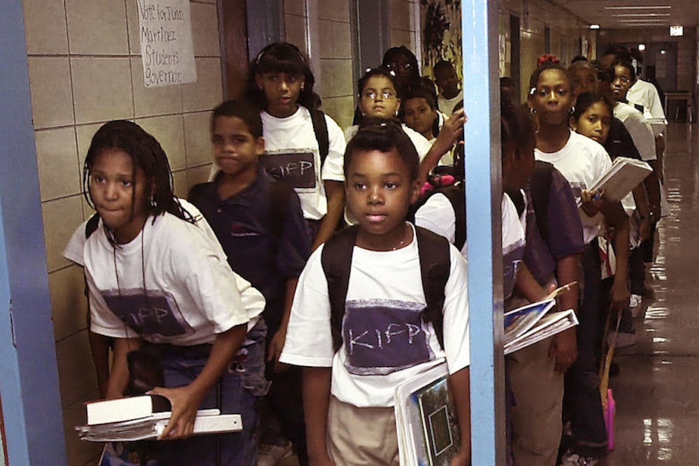 Levin claims that KIPP’s character education program is inspired by James Baldwin’s observation that “children have never been very good at listening to their elders but have never failed to imitate them.” It’s strange, then, that KIPP places such a strong emphasis on “labeling and talking about the character strengths” through conversations facilitated by adults. In footage from a seventh-grade math class featured in Levin’s online class, for instance, the teacher praises her students for working so hard, underscores the importance of “not giving up,” and then has the whole class say “grit” on the count of three.