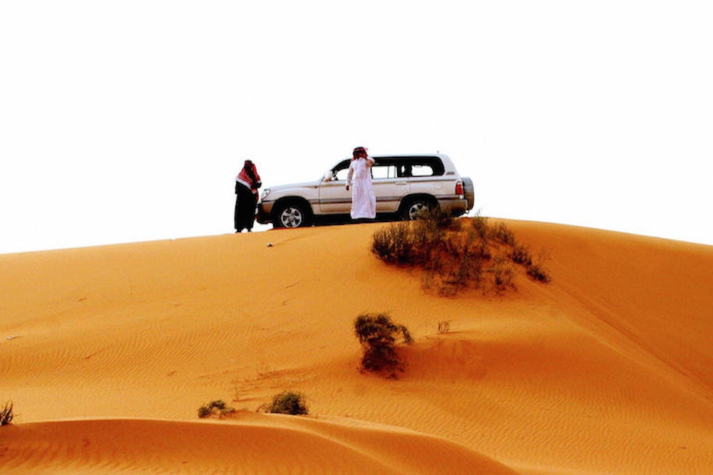 We are flying down an empty six-lane highway, on our way from Jeddah to Riyadh, a seven-hour drive, and I’m thinking of possible routes of escape. I’m in the passenger seat of a new Toyota sedan travelling at 87 mph through the Saudi Arabian desert and I’m racing through the implications of opening my door and leaping free.