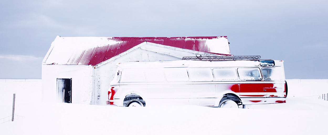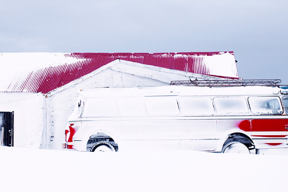 The vision of Iceland that resulted—a series titled Ísland—is a landscape where humans live in frontal confrontation with the elements, evidence of their existence appearing as a pop of color against a backdrop of pure, glaring white. A bright red bus is almost camouflaged in the snowy landscape; a lone figure staring into a precipice is a dark silhouette.