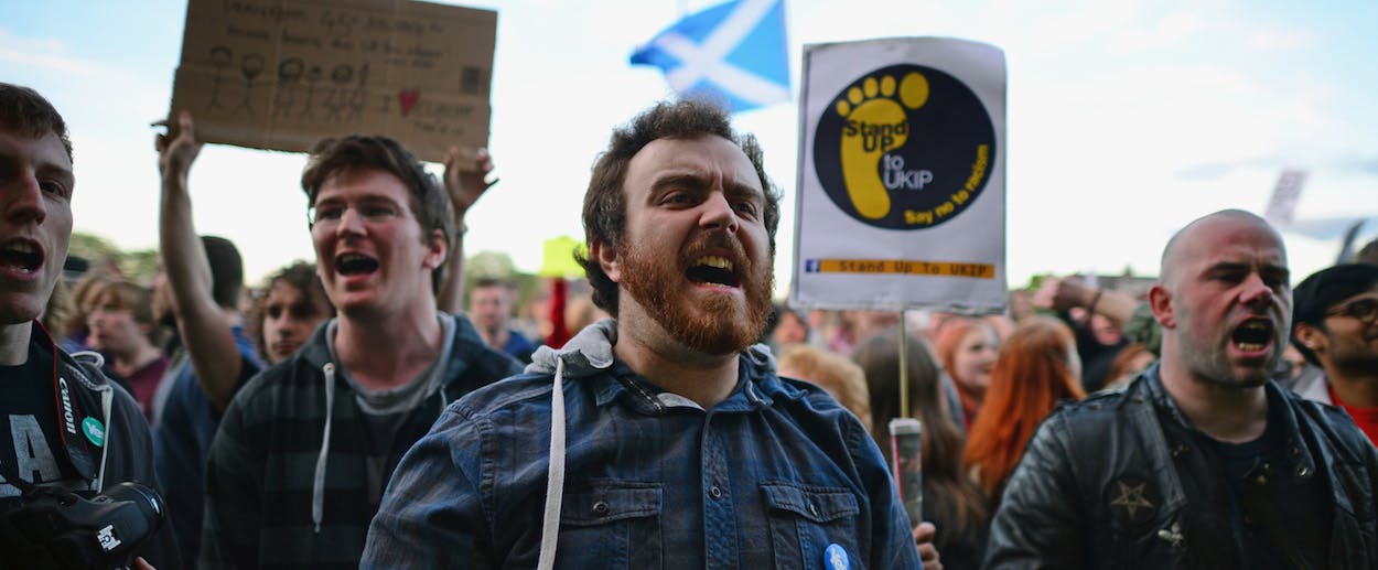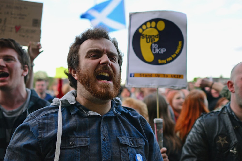 Some of that opposition has attached itself to far-right organisations—the British National Party (BNP), which is more English than its name implies, and the English Defence League (EDL). That support has since been subsumed into the growth of Ukip. At a public meeting on 1 April, Farage said he was “quite proud” to have poached a third of the BNP’s support since the last general election, and explained it as a strategy. “What we did,” he said, “is for the first time try and deal with the BNP question by going out and saying to BNP voters: ‘If you’re voting BNP because you’re frustrated, upset, with the changes in your community but you’re doing it holding your nose because you don’t agree with their racist agenda, come and vote for us.’”