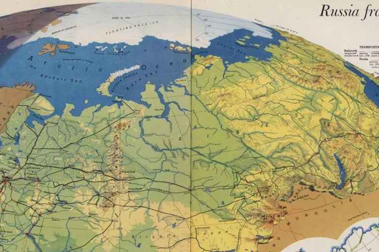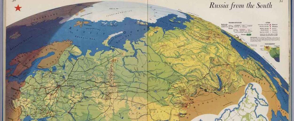 Harrison's ability to play with scale evokes the perspective of a pilot, but one placed at an infinite distance. Cartographers were quick to point out that no such perspective existed in nature, yet by drawing the topography with such care Harrison made the terrain far more real than it had been in the abstract representation of mountains used on traditional maps. His map of Russia from the south, created just before the end of the Hitler-Stalin Pact, powerfully illustrates the sheer size of the Soviet Union and its population. Notice his use of light and shadow to depict the multiple time zones encompassed by the Russian landmass, while the graphic at the lower right captured the massive growth of the urban population in the western regions.