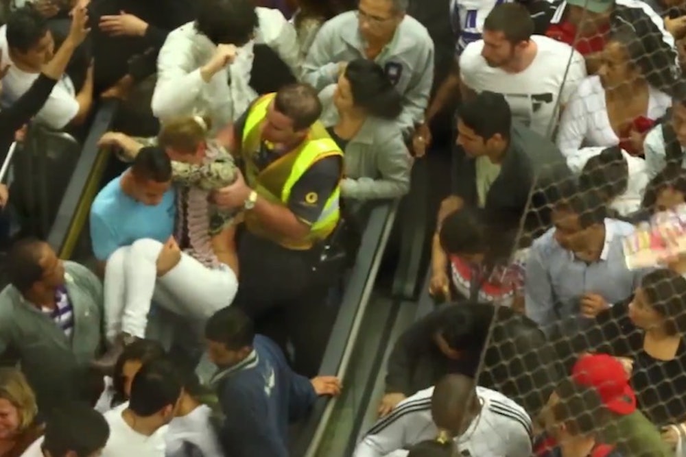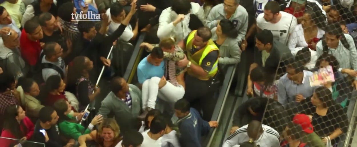 Brazilian daily Folha de S.Paulo on Wednesday posted this frightening video of an overcrowded Metro station in São Paulo, where bus drivers went on strike Tuesday to protest the terms of their union's deal with management. At least 300,000 commuters have been affected, but probably none more than several women in this video. One woman appears to faint as the crowd surges toward an escalator, and at last two others are trapped between ascending and descending escalators. Remember this the next time you consider whining on Twitter about a 10-minute delay in your subway commute.