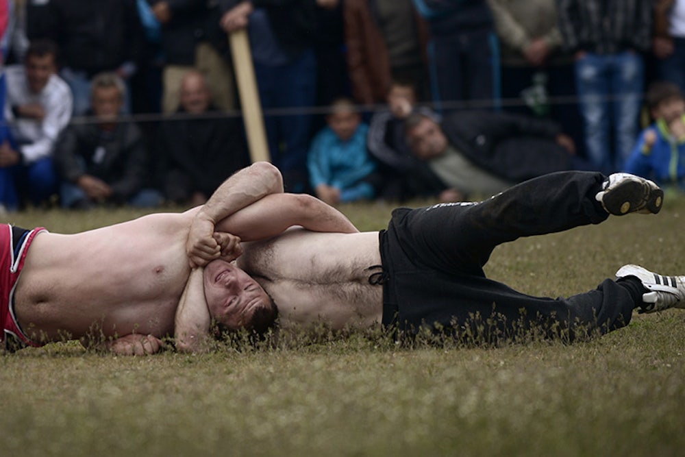 All of which confirms what was suggested at the outset—that this is more than just a sporting occasion. Change some of the details and this could be a scene from an African country where wrestling often accompanies a larger ritual celebrating the transition to manhood. Same here, it turns out: The bout is part of a holiday marking the circumcision of young boys. While the two wrestlers are obviously too old to be trying to circumcise each other (with their teeth?), it is possible to imagine that, rather than being in what looks to be a losing position, the guy in the red shorts is actually winning: that the face we can see belongs cartoonishly to the guy on the right in the black pants. Compared with the way his neck’s going to feel in the morning, circumcision might seem preferable.