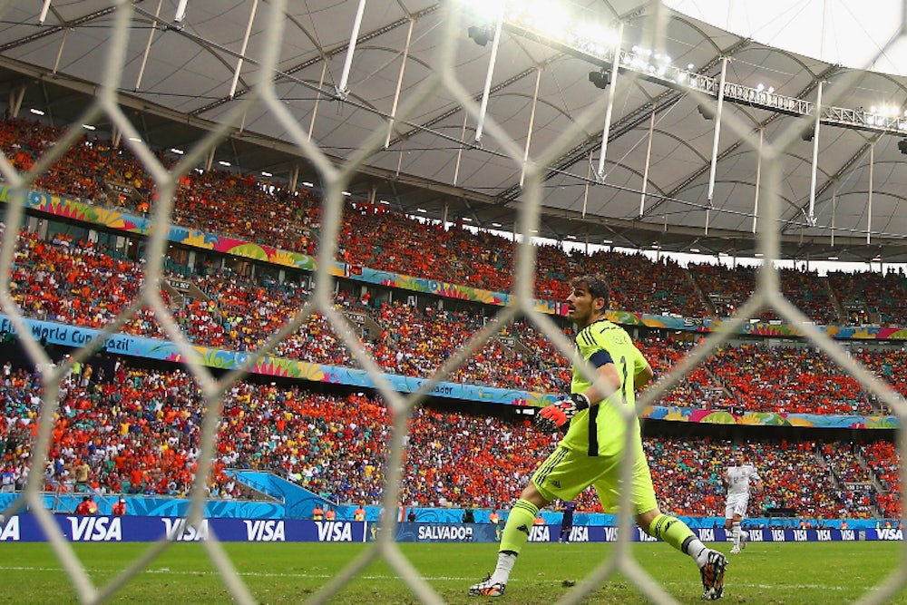 Everything was going to plan: it was already 1-0 when Spain’s David Silva found such a space in the Dutch back line near the 40th minute of the game. Andrés Iniesta sent him through with a defense-splitting pass, and Silva only had Holland’s goalkeeper, the young Jasper Cillessen, to beat. Silva advanced with the ball at his feet, but so did Cillessen, and so Silva tried to no avail to lob the ball over the keeper’s head. Cillessen, although crouching, threw his large hands up and knocked Silva’s soft shot out of bounds. It was perfect technique by the keeper—stifling the attacking space, defending low, prepared for a shot up high—but Silva should have scored. Spain’s players, like their fans in the stadium in Salvador, held their hands up to their faces. What could have been. What should have been. It’s perhaps the most used face in football, a game of near misses and almost-should-have—an amalgamation of the see-no-evil-hear-no-evil-speak-no-evil faces. The clock ticked on to the end of the half, and despite Silva flubbing his lines the game for Spain, winners of the last World Cup and the last two European Championships, had a familiar feel to it.